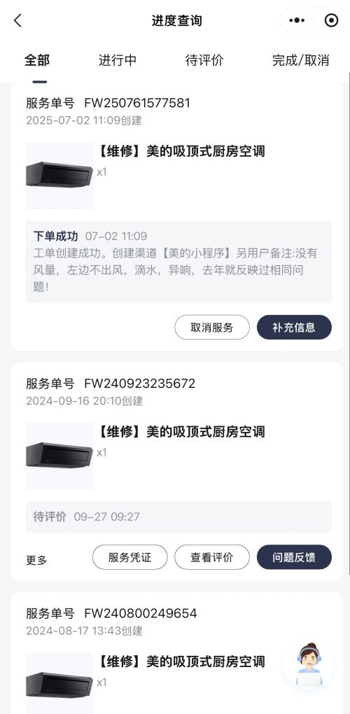 自安装伊始,这台肩负厨房凉爽重任的设备便频频罢工。“就像生了慢性病一样。”王女士翻出维修单据无奈地说。机器运行不到一个月,烦人的滴水声便首先造访;随后,“嗡嗡”异响在烹饪时持续伴随;制冷明显乏力,“站在出风口都感觉不到凉意”;导风板机械声和送风不畅等问题接踵而至。频繁的报修记录显示,售后人员几次上门调试更换零件后问题依旧。