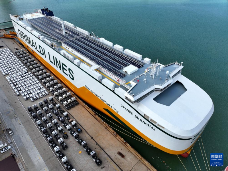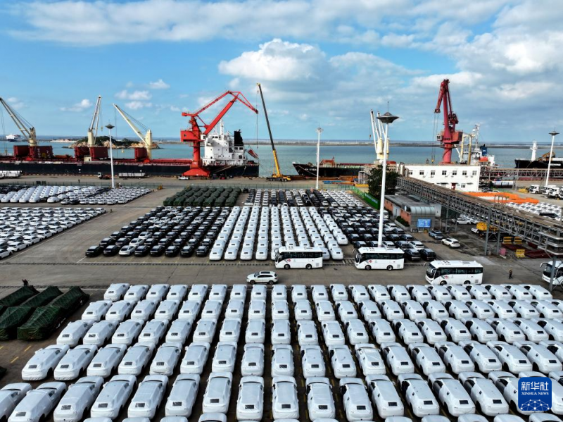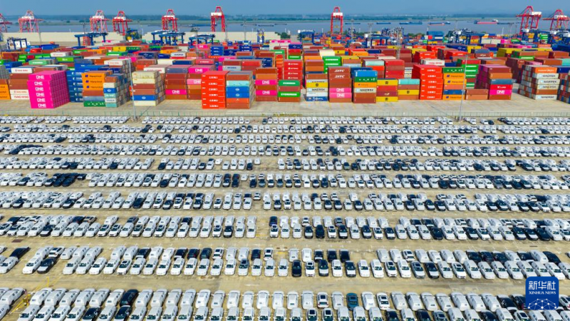 10月4日在江苏省港口集团南京港龙潭港区拍摄的准备装船出口的汽车(无人机照片)。