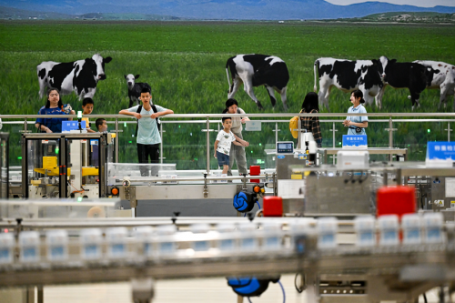 2025年7月28日,游客在呼和浩特市伊利现代智慧健康谷液态奶全球智造标杆基地参观。新华社记者 李志鹏 摄