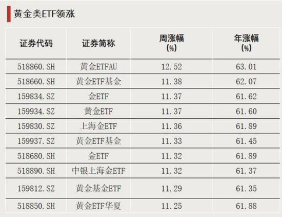上周,全市场周涨幅前十ETF全部为主投黄金的产品,涨幅均超过10%。10只产品中,半数挂钩SGE黄金9999指数,半数挂钩上海金指数。