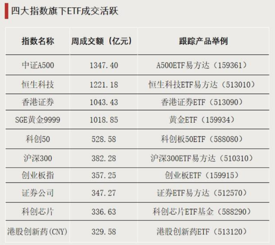 按照成交额口径汇总(剔除货基与债基指数),上周共有中证A500指数、恒生科技指数、香港证券指数、SGE黄金9999指数等4个指数旗下ETF周成交额超过1000亿元。