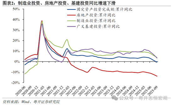 9月经济表现呈现出分化格局,主要经济指标增速有升有降。一方面,外需好于内需,出口高增带动工业生产加快,9月规模以上工业增加值同比由8月的5.2%回升至6.5%。另一方面,内需仍然不足,消费仍较低迷,社会消费品零售总额同比进一步降至3.0%;固定资产投资累计同比更是由正转负。消费的走弱,既有去年同期基数抬升的扰动,也有政策效果边际递减的影响,同时还受到了外卖平台补贴回落、关于“预制菜”的讨论等因素扰动。投资方面,设备更新改造空间收窄导致制造业投资从高速增长逐步回落;房价仍未有效止跌回稳,房地产投资持续下滑;此前支撑基建投资的电力和水利投资也见顶回落,加之地方财政紧平衡制约,基建投资的支撑力量有所减弱。