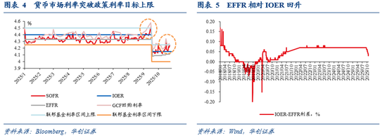 1)货币市场回购利率相对于联邦基金利率已经上升,并且在特定日期(比如9月15日的公司纳税截止日期)出现了更显著的流动性紧张的压力。从9月中旬以来,GCF回购利率和SOFR利率持续走高,并突破联邦基金利率目标上限。