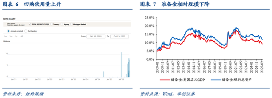 结束缩表的原因是:1)货币市场已明确出现“准备金降至略高于与充足准备金条件相符的水平”的迹象,从9月中旬以来,货币市场利率(GCF回购利率和SOFR利率)持续走高并突破联邦基金利率目标上限,有效联邦基金利率相对于准备金余额利率上升,常备回购便利工具使用量开始上升,隔夜逆回购耗尽。2)准备金相对规模下降至联储测算的区间。目前储备金余额占名义GDP的比例约9%、占银行总资产的比例约12%,这一水平已达到纽约联储曾估算的合意区间,即占名义GDP比例约8-10%,占总资产比例约12-13%。
