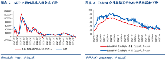从就业来看,9月份劳动力市场依然在持续渐进地降温。由于美国政府关门,9月非农就业报告并未公布。从三方数据来看,就业状况延续疲软但并未加速恶化。ADP 估计,私人就业人数继8月份减少3000人后,9月份再度减少32000人。该公司表示,“大多数行业的就业创造继续失去动力“。在线求职公司Indeed 的招聘信息数据显示,就业人数持续逐渐减少,但招聘人数并未大幅下滑。