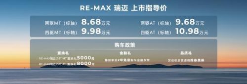 全新RE-MAX瑞迈上市指导价8.68万起,同步推出多重购车礼包:购买柴油2.8T手动挡车型可享5000元置换礼,自动挡车型可享8000元置换礼,并可叠加享受2年免息金融政策。
