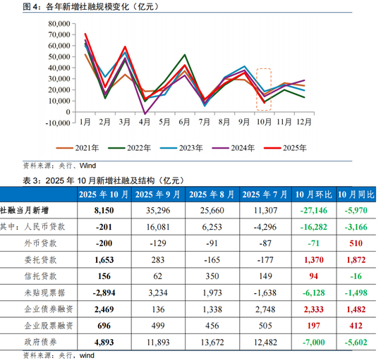 从金融数据可以看出,在季节性效应、政策影响以及中长期趋势变化下,10月信贷增速延续回落,但社融、M2增速仍维持在相对高位,反映金融对实体经济的支撑仍有力。