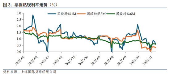 票据利率低位运行,票据融资支撑加大。10月,1M、3M、6M期票据转贴利率中枢分别为0.72%、0.26%、0.63%,环比9月下行67bp、98bp、17bp。月末一周1M、3M期票据利率报价均触及零利率下限,指向月末收票力度加大,存在一定填补信贷缺口的需求。