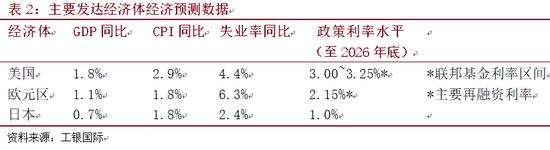 欧洲方面,经济仍处于低速增长区间。短期内,财政政策仍对经济提供一定支撑,但长期来看,债务规模上升已在压缩财政空间,未来政策对经济的支撑作用将趋于有限。预计2026年欧元区延续温和增长,保持大约1.1%的GDP同比增速,通胀水平预计保持在1.8%,利率维持在2.15%(主要再融资利率)。