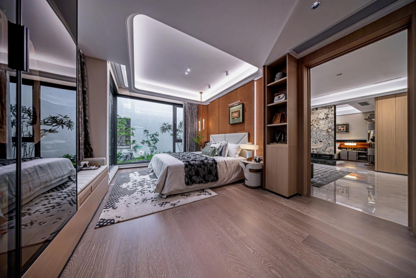 更难得的是,在保证超大公区的同时,也没有牺牲私密空间。主卧套房面积约23.6㎡,堪比市面上130㎡户型的配置,还配有L型270°观景窗,将园林景致全方位引入室内。两间次卧面积也分别达到了约10.5㎡和11.34㎡,彻底告别局促感,无论是二孩家庭还是三代同堂,都能一步到位。