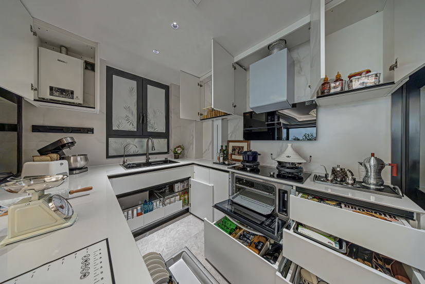 最后,首钢·璟悦长安在精装标准上做了诚意投入,打造了“满配精装”“全屋智能”。走进厨房,从化解闷热的凉霸、实时监测水质的净水系统、恒温燃气热水器到蒸烤一体机、油烟机、洗碗机、双开门大容量冰箱(带制冰功能)等,所有高端电器一步配齐,让烹饪成为一种享受。