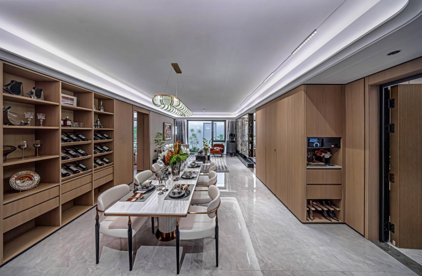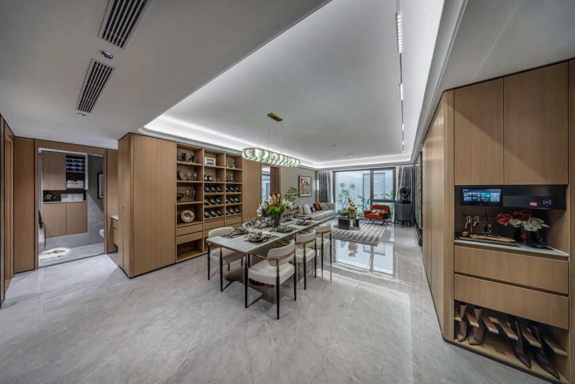 其次,首钢·璟悦长安构建的全屋收纳系统,其收纳空间远超越市面同级产品,彻底解决了改善家庭的杂物收纳难题。在公区,玄关收纳柜体、餐边收纳柜体提供大容量的展示与储藏空间;在卧室,精细化收纳体系让包包、衣物、零碎物件各归其位,飘窗、衣柜等提供封闭、大容量收纳空间;在卫浴间,分类收纳体系实现干湿分离,台面永不杂乱;独立家政区则通过灵活的洞洞板墙面,让清洁工具、运动器械等全数上墙,让日常物品取用井然有序。