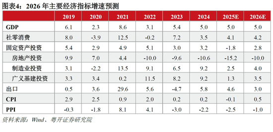 预计2026年GDP增速仍保持在5%左右,全年或呈“U型”走势:一季度在财政金融政策靠前发力及地方政府提前开工的支持下有望实现“开门红”;二季度可能受内生动能波动和外部冲击影响略有放缓;三季度筑底企稳;四季度在政策推动下回暖。