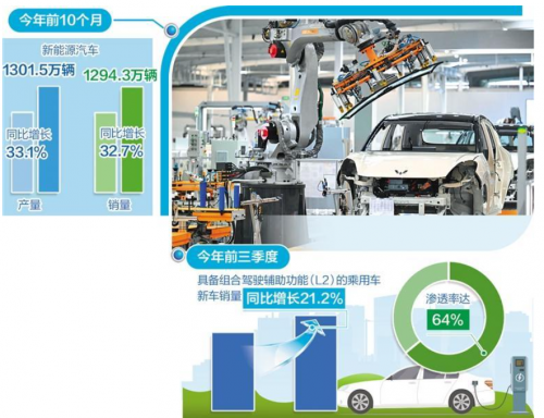 中国汽车工业协会数据显示,今年前10个月,我国汽车产销量分别完成2769.2万辆和2768.7万辆,同比增长均超过10%。其中,新能源汽车产销量分别完成1301.5万辆和1294.3万辆,同比分别增长33.1%和32.7%。