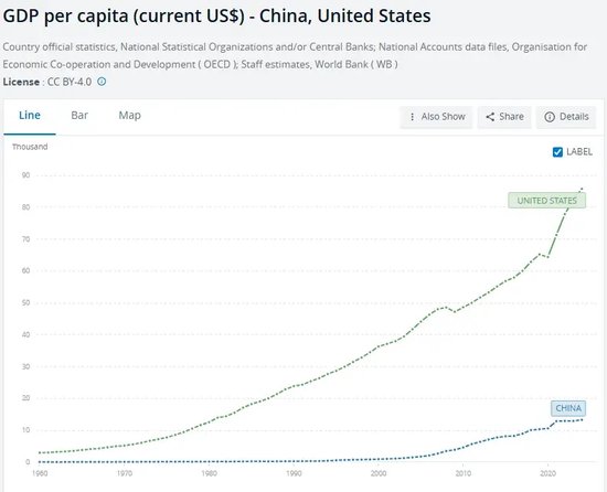 以当前市场汇率计算,中国人均GDP是美国的七分之一(图为1960-2024年中美人均GDP走势图)世界银行截图