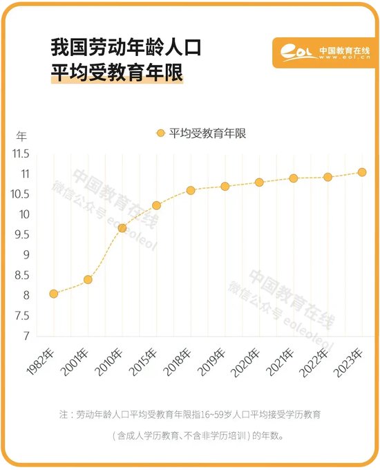 截至2024年底,中国16-59岁劳动年龄人口的平均受教育年限达到了11.21年。尤其是新增劳动力平均受教育年限已经超过14年,能有效缓解老龄化对经济增长的不利影响