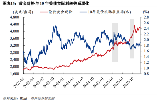 黄金可能受益于适度降息与美联储独立性风险。一方面,美联储适度降息与经济稳定,有利于减少金融波动及流动性风险,利好黄金。另一方面,本轮黄金价格与美债利率的相关性弱化,尽管美联储降息幅度不高、美债利率下行空间受限,但如果美联储独立性弱化,美国财政前景与美元信誉担忧继续发酵,黄金仍将继续受益。2025年,黄金价格与10年美债实际利率继续出现背离,尤其在4月“对等关税”和10月美国政府停摆后,美债实际利率走高,并未阻止金价走高。