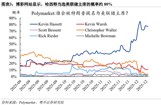 新一任美联储主席换届前景逐渐清晰,哈西特较可能当选,政策取向偏鸽。现任美联储主席鲍威尔任期将于2026年5月15日结束。按照惯例,美国总统通常在换届前3-6个月才会开始物色和宣布新人选。但本轮特朗普政府有意提前,自今年6月起已公开讨论潜在人选,有意弱化鲍威尔的市场影响力。今年10月,白宫透露新一任联储候选人范围已由11人缩减至5人;11月下旬以来,白宫和媒体积极暗示凯文·哈西特将成为下任联储主席。特朗普12月2日称,可能于2026年初公布新任主席提名。目前,美国博彩网站(Polymarket)显示哈西特当选概率约80%。哈西特现任白宫国家经济委员会主任,长期服务于共和党政府财税政策制定,曾表态支持更大幅度和更持续的降息路径,可能推动宽松货币政策以配合特朗普的扩张性财政政策。不过,哈西特12月8日最新讲话偏中性,强调货币政策必须依据经济数据,拒绝给出未来半年的降息路径指引。