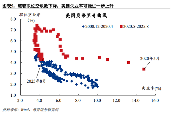 2026年美国就业市场可能维持弱势。美国失业率由今年1月的4.0%升至9月的4.4%,创2021年10月以来最高,且略高于美联储预测的长期失业率4.2%;在官方数据缺失的背景下,参考芝加哥联储预测,10-11月美国失业率或升至4.45%左右。美国就业市场走弱受多方面因素影响,包括趋势因素、政策扰动以及人工智能(AI)发展对劳动力的替代效应等。展望2026年,预计美国就业市场仍可能进一步降温,但不急剧恶化;失业率可能升至4.5%以上。最新贝弗里奇曲线(职位空缺率与失业率相关性曲线)显示,随着职位空缺数下降,美国失业率可能进一步上升。