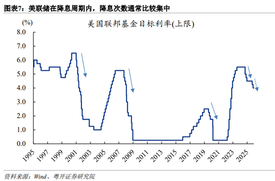 降息节奏存在不确定性,我们认为较有可能在上半年兑现。据芝商所(CME FedWatch)数据,截至12月8日,市场预期2026年两次降息分别于3-4月和7-9月兑现。但根据历史经验,美联储在降息周期内,降息次数通常比较集中,例如2023年7月开启降息后连续4次降息、2019年8月开启降息后连续3次降息等。主要原因在于,美联储通常在感受到通缩压力后才开启降息,而从降息到经济数据的改善存在时滞,而美联储需要看到数据改善后才有信心暂停降息。具体来看,我们预计2026上半年,美国就业市场维持疲弱,通胀保持相对稳定,美联储较有理由在2026上半年集中降息;此后,伴随降息对经济的积极影响显现,就业市场逐步企稳,美联储则可能暂停降息。