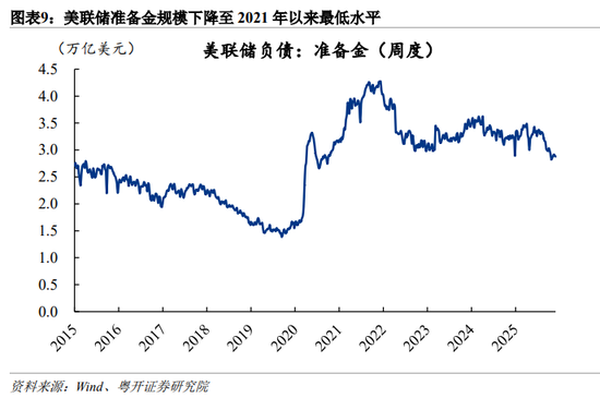 2025年美联储先后放缓和停止缩表,准备金不够“充足”的风险上升。美联储自2008年以后实行“充足准备金”框架,通过向存款机构付息来控制联邦基金利率,而不再依赖于公开市场操作,这需要确保银行体系中的准备金水平至少“充足”。2025年4月起,美联储进一步放缓缩表,将国债减持速度从每月250亿美元降至50亿美元,维持抵押支持证券(MBS)减持速度为每月350亿美元。12月起,美联储结束缩表。