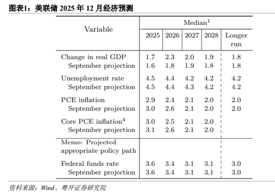点阵图中位数维持2026年仅降息一次,但官员分歧仍然严重,反映出美联储内部对经济的核心矛盾是通胀还是就业、明年经济形势如何并未达成一致。相比9月时的经济预测,12月经济预测对经济增长更加乐观,维持失业率预测,小幅下修通胀预测,进一步描绘出“软着陆”的乐观图景。