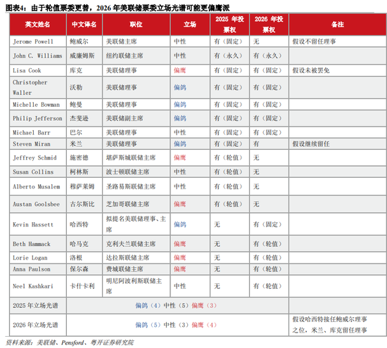 展望2026年,美联储票委人员变化更加关键,其中4位轮值票委将更偏鹰派,白宫掌控美联储的实际难度较大。联邦公开市场委员会(FOMC)票委共12人,包括7位理事、1位纽约联储主席和4位轮值地区联储主席。2026年比较确定的变化是,4位轮值票委的更替,即哈马克(偏鹰)、洛根(偏鹰)、保尔森(偏鹰)和卡什卡利(中性)将作为新票委,替换2025年的施密德(偏鹰)、古尔斯比(中性)、柯林斯(中性)和穆萨莱姆(中性)。这可能让票委整体更偏鹰派。此外,三位理事的去留存在变数:一是鲍威尔的去留,尽管按照管理,美联储主席届满后,通常会同时辞去理事职位,但鲍威尔目前尚未表态其会否辞任,理论上其可以继续担任理事至2028年1月。二是米兰的去留,其临时任期于2026年1月到期。若鲍威尔留任理事,米兰较大概率需要卸任,哈西特接任理事之位以担任主席;若鲍威尔辞职,米兰则可能继续连任理事。三是库克的去留,特朗普罢免威胁的案件预计将于2026年1月获得最终裁决。目前来看,可能性较大的情形是鲍威尔不留任、库克继续留任,那么即使哈西特替换米兰担任理事和主席,2026年票委结构较2025年仍将更偏鹰派。