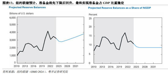 美联储结束缩表后,准备金规模仍可能惯性下降,这意味着流动性不会明显宽松,反而可能阶段性紧张。根据鲍威尔2025年10月的演讲稿,在美联储停止缩表后,准备金余额预计将继续下降,因为美联储其他负债还会增加;在达到某个时候,美联储将确定准备金已经下降至“充足”水平,并在此后根据需要管理持有的资产,使得准备金保持在“充足”水平。纽约联储(OMO 2024)报告预计,2026年上半年准备金将下降至“略高于2.7万亿美元”的水平,7月以后将开始温和增长,以实现准备金占名义GDP比重的基本稳定。这意味着,如果美联储仅停止缩表而不进行其他管理和干预,银行体系很可能继续出现流动性紧张的情况。