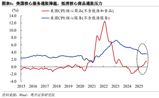2026年美国通胀反复的风险相对可控,关税对通胀的影响低于预期,服务通胀降温。今年以来,美国核心CPI和核心PCE通胀率分别保持在3%和2.8%附近窄幅波动。一方面,关税对美国商品终端价格的传导存在多个堵点。另一方面,服务通胀回落抵消了商品通胀的上升,限制了整体通胀水平。美国核心服务(不含能源服务)CPI同比在今年1-9月由4.3%下降至3.5%,对核心CPI通胀率的贡献下降了0.6个百分点,抵消了核心商品对核心CPI通胀产生的0.4个百分点的拉动。核心服务通胀改善主要得益于住房通胀降温。2026年,美国商品和服务通胀走势可能保持分化,导致核心通胀较2025年可能温和下降,但仍高于2%通胀目标。