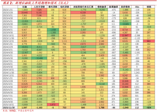社融结构分析:11月社融规模同比多增1597亿元,信托贷款、债券融资与未贴现银行承兑汇票规模同比多增;信贷、政府债同比少增。具体来看,1、表内信贷情况:信贷投放低于往年同期,仍是主要拖累项;预计年底收官,项目储备留至年初开门红。11月人民币贷款新增4053亿元,较去年同期少增1163亿元。2、表外信贷情况:委托贷款同比基本持平。未贴现银行承兑汇票增加1490亿元,同比多增580亿元;信托贷款增加844亿元,同比多增753亿元;委托贷款减少188亿元,同比少增5亿元。3、债券和股权融资分析:①政府债去年高基数等原因同比少增。11月政府债新增融资1.2万亿元,同比少增1048亿;随着政府债逐渐发行完毕,叠加高基数的影响,政府债对社融的支撑力度持续减弱。②企业债在低基数下同比多增,股票融资则同比少增。11月新增企业债融资4169亿,股票融资新增342亿,分别同比变化+1788亿、-86亿。