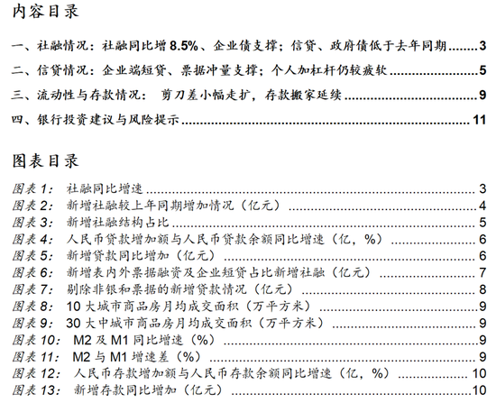 流动性与存款情况:11月M1增速回落,M2与M1的剪刀差小幅走扩。11月M0、M1、M2分别同比增长10.6%、4.9%、8.0%,较上月同比增速分别0.0、-1.3、-0.2个百分点。M2-M1的剪刀差为3.1%,较上月扩大1.1个百分点。11月人民币存款增加1.4万亿元,同比少增7600亿元,存款同比增7.7%,增速较上月微降0.3个百分点。居民存款同比少增,预计存款搬家态势仍在延续,企业、非银存款同比少增,财政同比多减。1、居民存款:11月居民存款增加6700亿元,较去年同期少增1200亿元。2、企业存款:11月企业存款减少6453亿元,较去年同期多减947亿元。3、财政存款:11月财政存款减少500亿元,较去年同期多减1900亿元。4、非银存款:11月非银存款增加800亿元,较去年同期少增1000亿。