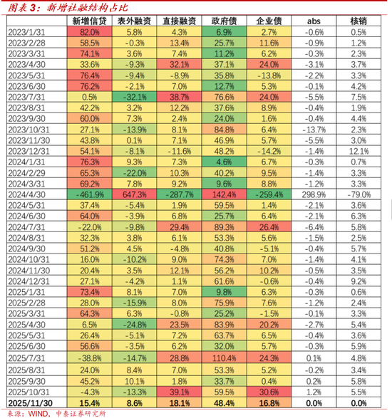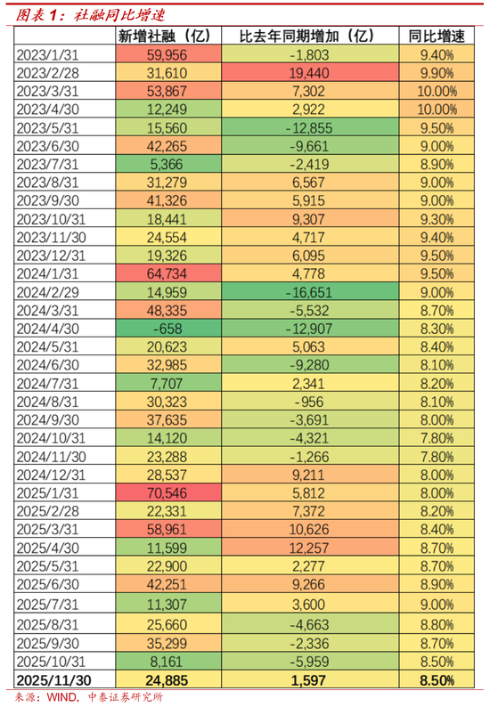 社融情况: 11月社融新增2.49万亿元,较去年同期多增1597亿元,新增规模高于万得一致预期(2.02万亿元)。前11月累计社融同比增8.5%,增速较10月持平。