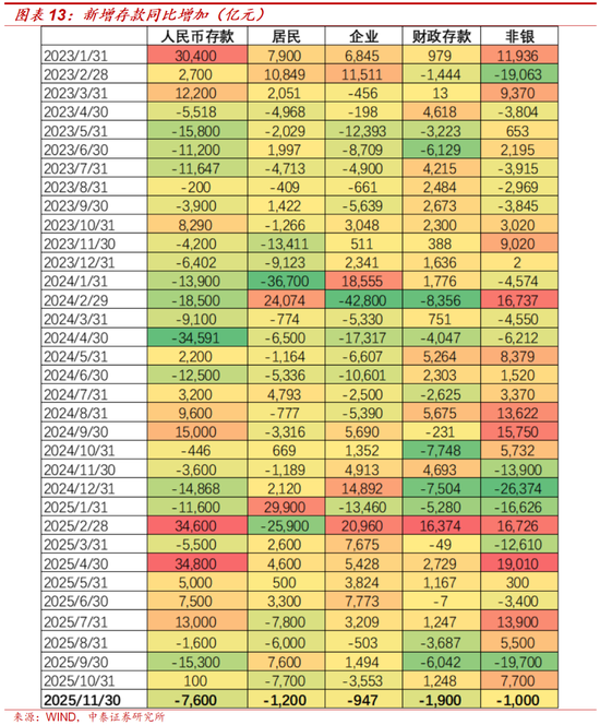 信贷结构分析:居民贷款少增较多,短贷与票据支撑企业贷款同比多增3600亿元。10月新增贷款较去年同期少增1900亿,其中居民短贷、中长贷分别同比少增1788和2900亿元。企业短贷同比多增1100亿元,企业中长贷同比少增400亿元;票据同比多增2119亿元。具体来看:1、企业贷款情况:短贷与票据冲量,中长贷同比少增。11月企业短贷、中长期贷款、票据净融资增量分别为+1000亿、+1700亿和+3342亿元,增量较上年同期变化分别为+1100、-400亿和+2119亿。2、居民贷款情况:短贷与中长贷均同比少增,反映消费和地产景气度均仍在低位(以及去年消费补贴在下半年开启,形成相对高基数)。11月居民短贷、中长贷增量分别为-2158亿元、+100亿元,较去年同期分别变化-1788、-2900亿。3、非银信贷:少147亿元,较上年同期多增554亿。