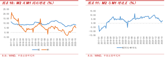 11月M1增速回落,M2与M1的剪刀差小幅走扩。11月M0、M1、M2分别同比增长10.6%、4.9%、8.0%,较上月同比增速分别0.0、-1.3、-0.2个百分点。M2-M1的剪刀差为3.1%,较上月扩大1.1个百分点。