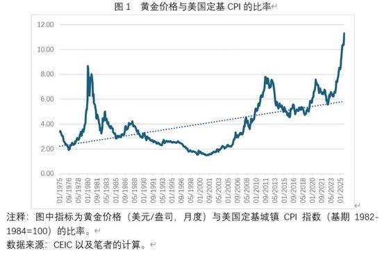 长期以来,黄金价格被认为能够对抗通货膨胀。Erb与Havey(2013)的研究发现,历史上黄金价格与美国定基CPI指数的比率平均为3.2倍,这个比值可以视为反映黄金购买力波动均值的黄金常数,且黄金价格大约在10年左右的时间维度内呈现均值回归的趋势。不过如图1所示,随着2022年之后黄金价格不断创出历史新高,黄金价格与美国定基CPI指数比率的均值不断抬升,目前已经接近6倍左右。值得注意的是,自2010年以来至今,黄金价格与美国定基CPI指数的比率大致已经连续15年高于历史均值,且当前黄金价格与美国定基CPI指数与均值的偏离程度,已经与1980年初的上一次历史高位相仿。换言之,从黄金价格对抗通货膨胀的视角以及均值回归的视角来看,黄金价格回落调整的概率随着时间的推移将会不断上升。