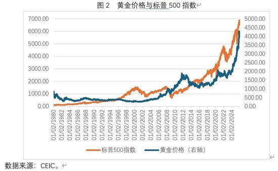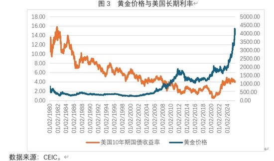 从理论上而言,黄金价格走势应该与利率走势负相关。一方面,在利率偏低时期,通胀预期较高,这会推动黄金价格上涨,反之则反是;另一方面,与利率下降相伴随的流动性宽松也可能推高黄金价格。然而如图3所示,在1980年至2000年期间,黄金价格走势与美国10年期国债价格走势的关系并不显著。在2000年至2020年期间,两者的关系大致呈现出负相关。但在最近几年内,两者的关系再度变得不显著。例如,在2020年下半年至2023年上半年期间,10年期美国国债利率显著上升(由0.5%上升至4%以上),但黄金价格整体上呈现盘整态势。又如,在2023年下半年至今,10年期美国国债利率整体上以盘整为主,但黄金价格却一路飙升。预计在未来一段时间内,美国长期利率走势不会成为影响黄金价格走势的主要因素。