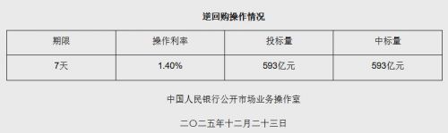 据央行网站消息,2025年12月23日中国人民银行以固定利率、数量招标方式开展了593亿元7天期逆回购操作。具体情况如下: