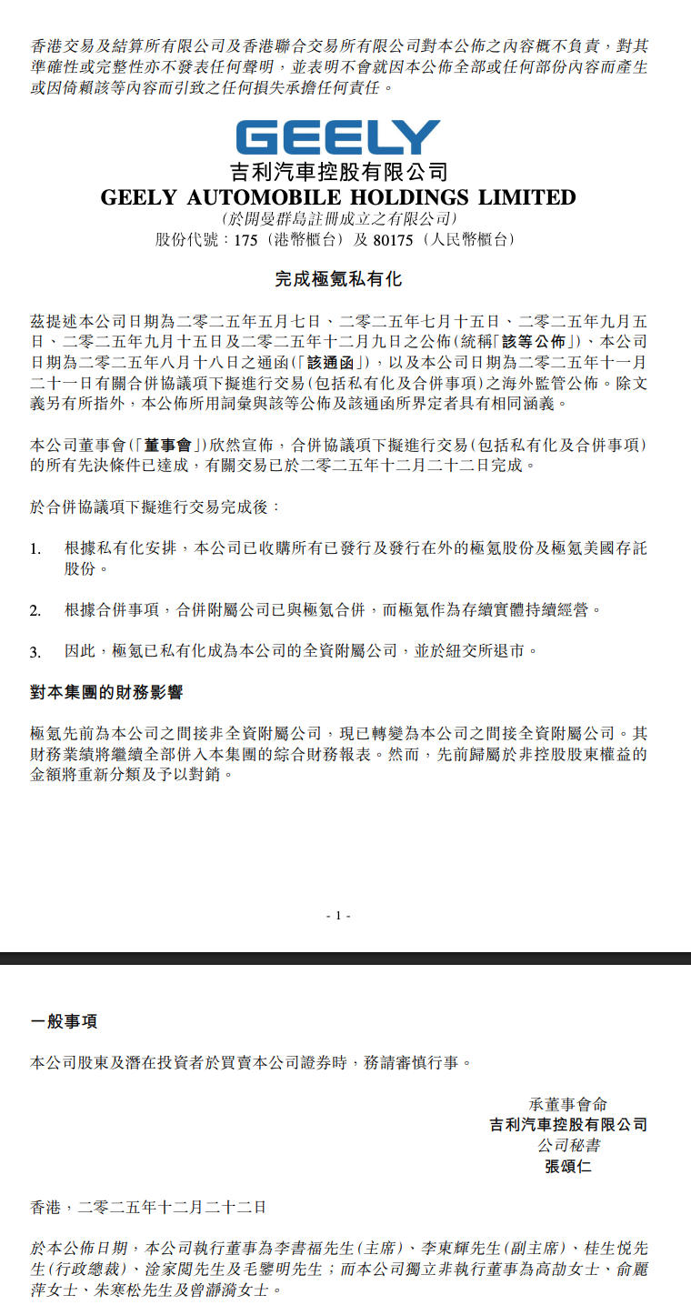 12月22日晚间,吉利汽车控股有限公司(00175.HK)发布公告,正式宣布已完成对极氪智能科技控股有限公司的私有化及合并交易。即日起,极氪成为吉利汽车的全资附属公司,并从纽约证券交易所退市。这场始于今年5月的整合计划,在历时7个月后终于尘埃落定。