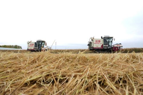 2025年10月11日,北大荒集团闫家岗农场,机械设备在进行水稻收获作业。新华社记者 王松 摄