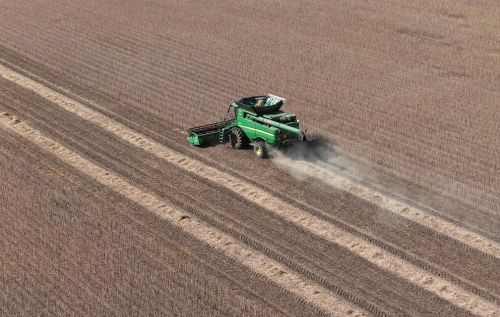 2025年9月23日,大型农业机械在进行大豆收获作业(无人机照片)。新华社记者 王松 摄