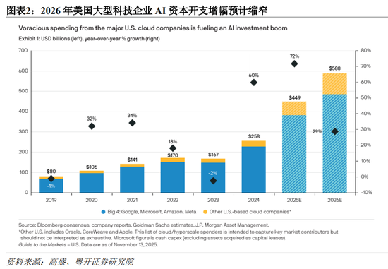 2026年美国企业AI投资增速可能回落。2025年,AI相关投资对美国GDP增长的拉动显著。根据美国大型科技公司已经公布的资本开支计划,2026年AI相关投资仍将进一步增长,但是同比增幅可能缩窄,这也意味着其对GDP增长的拉动可能减弱。据高盛统计,美国七大科技公司的资本开支将由2025年的约4490亿美元,增加至2026年的5880亿美元,但同比增速将由72%显著回落至29%。