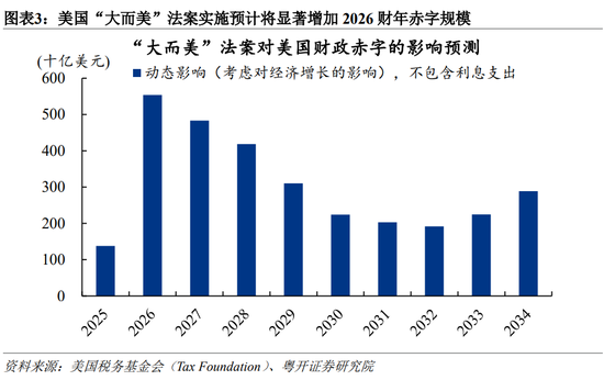 “大而美”减税法案预计将明显增加美国2026财年赤字规模。特朗普政府于2025年7月签署了《大而美法案》,核心内容是减税,将增大未来十年的财政赤字,属于扩张性财政政策。美国预算办公室(CBO)测算,相较2025年1月的基准预测,该法案将在未来十年增加美国预算赤字3.4万亿美元(不含利息支出)。再参考美国税务基金会(Tax Foundation)测算,考虑到法案对经济增长的提振可能帮助消化部分赤字,“大而美法案”在未来十年将较基准情形增加美国财政赤字合计3.0万亿美元,其中2026财年增加赤字(不含利息支出)5538亿美元,同比2025财年增长三倍。