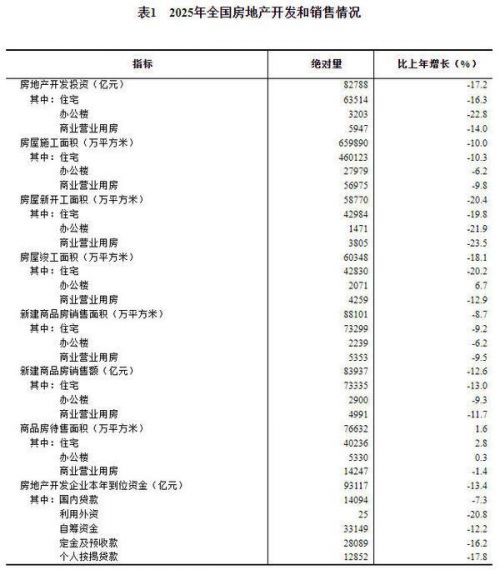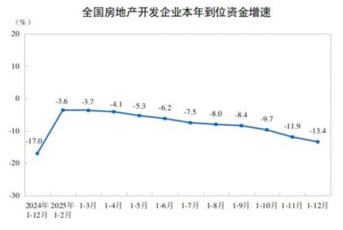 2025年,房地产开发企业到位资金93117亿元,比上年下降13.4%。其中,国内贷款14094亿元,下降7.3%;利用外资25亿元,下降20.8%;自筹资金33149亿元,下降12.2%;定金及预收款28089亿元,下降16.2%;个人按揭贷款12852亿元,下降17.8%。