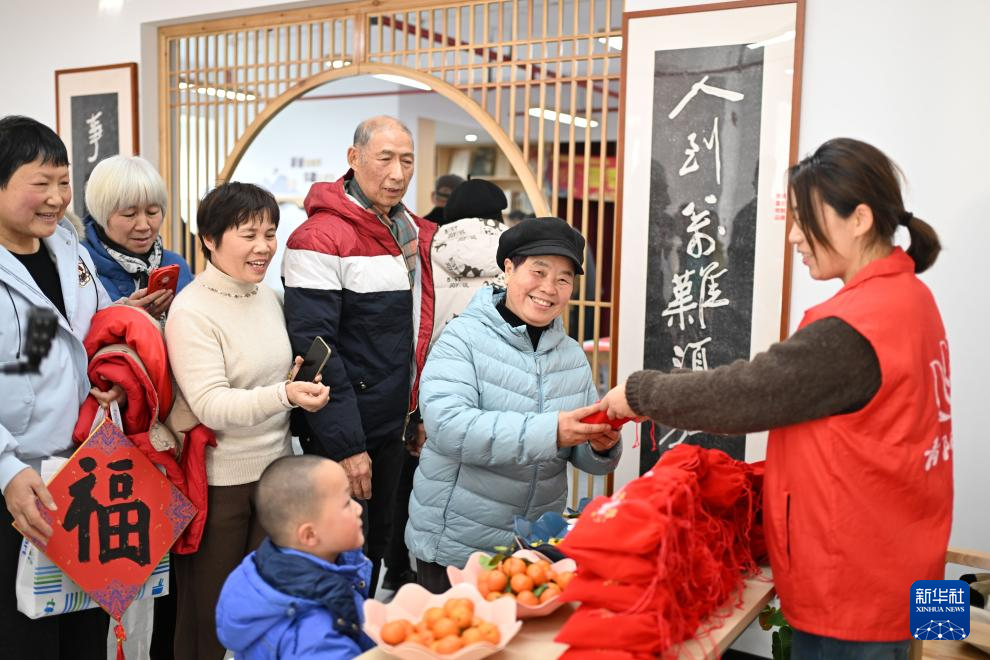 1月22日,居民在江苏省昆山市昆苑社区新时代文明实践站领取新年福袋。
