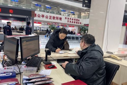 1月8日,辽宁省锦州市政务服务中心综合出件窗口工作人员为前来办事的群众发放证件。