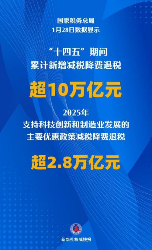 记者1月28日从全国税务工作会议上获悉,在经济增长等因素带动下,2025年,税务部门全年征收各项税费33.1万亿元,税费收入预算目标圆满完成。落实支持科技创新和制造业发展的主要优惠政策减税降费退税超2.8万亿元。“十四五”期间,税务部门累计征收税费超156万亿元,约占全口径财政收入的80%;累计新增减税降费退税超10万亿元,为经营主体发展壮大提供了有力支持。
