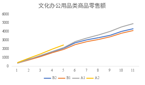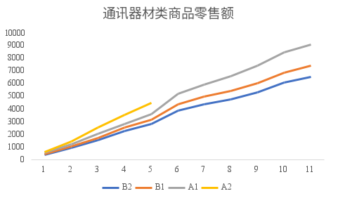 可以看到,“以旧换新”政策实施后的第一个完整年份(下图中A1)相关品类商品销售额增长10%,明显快于政策实施前(年度仅增长约3%,下图中B1);但政策实施后的第二个不完整年份(下图中A2)仅比政策实施后的第一年同期增长约2%,明显慢于政策实施后第一年同期比政策实施前约9%的增长。