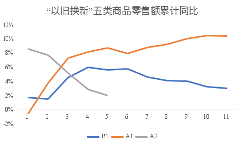 我们分别按照上述方法对“以旧换新”影响的五大类商品零售额进行分析。我们发现: