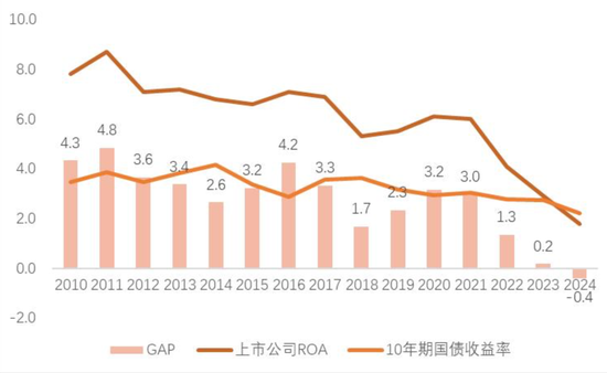但当前情况已大不相同。尽管经过多轮降息,十年期国债收益率已降至约2%,但上市公司的平均ROA也同步下滑至约2%。也就是说,投资回报率与融资成本基本持平,甚至在某些情况下为负。从图1可以看出,用ROA减去融资成本所形成的“有效盈利空间”已接近零。在这种环境下,企业缺乏扩大投资的动力。