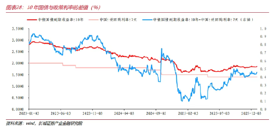 简而言之,在降息周期,投资者往往预期政策利率会持续下降而不断在左端进行抢配,后续市场利率向政策利率收敛是常态;而在加息周期,市场会提前及超幅反映对未来的担忧,导致发散。当前我国仍正处于货币政策适度宽松的周期中,7天逆回购利率作为重要的政策利率锚维持在1.4%附近,而10年期国债收益率在1.85%左右波动,两者之间存在约45个基点的利差,高于近两年的均值,而后续在经济持续复苏和降息的大周期中,我们认为市场利率存在进一步向政策利率靠拢的可能性(而且2026年可能还会降息)。这一点更支撑了当前利率上有顶,下有空间的状态。